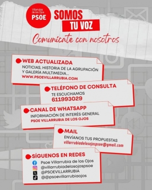 Tu opinión, tus ideas y tus propuestas son importantes para seguir construyendo un futuro mejor para nuestro pueblo. Comunícate con nosotros a través de: WEB : www.psoevillarrubia.com Teléfono Whatsapp: 611 993 029 Correo electrónico: villarrubiadelosojospsoe@gmail.com Y no te pierdas nada siguiéndonos en redes sociales: Facebook, Instagram, X y TikTok. ¡TU VOZ CUENTA, PARTICIPA Y HAZTE ESCUCHAR!
